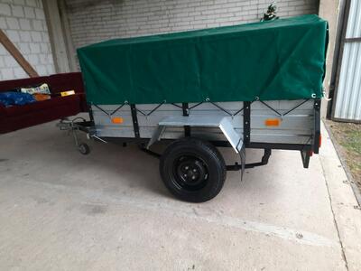 Przyczepka jednoosiowa firmy Stema z plandeka Masa własna: 240 kg Maksymalna waga ładunku: 508 kg Masa ...
