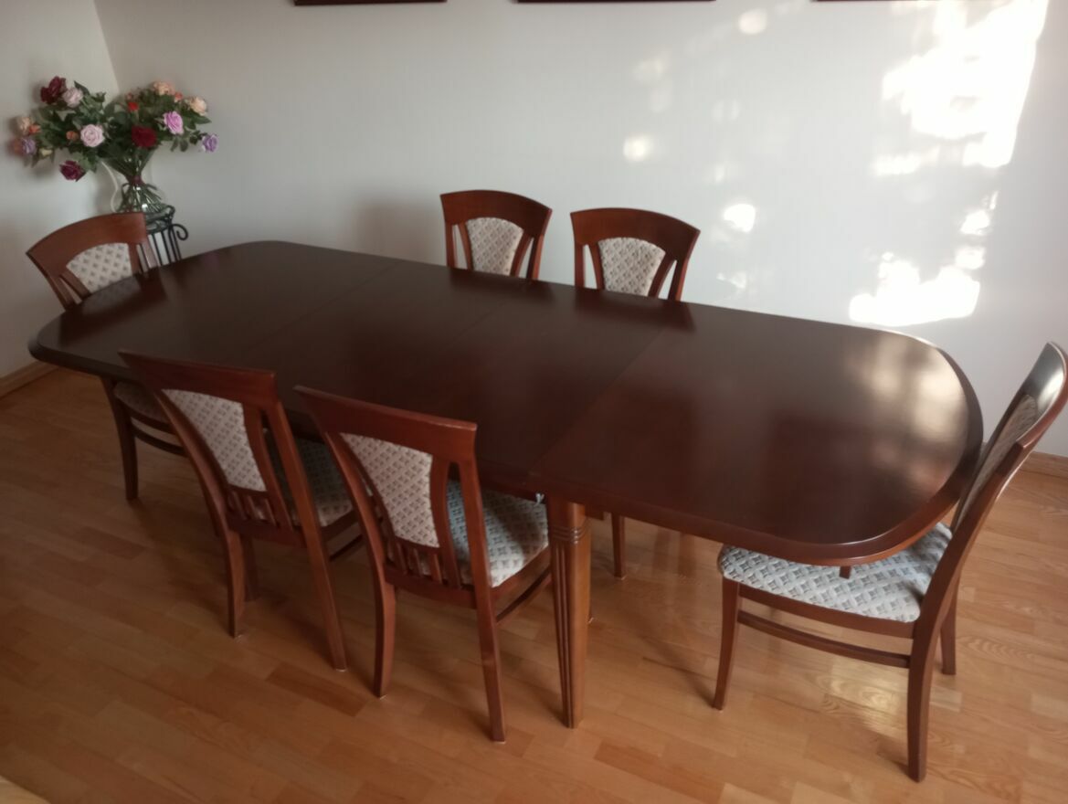 Piękny rozkładany stół z 6 krzesłami. Wymiary: 160x100cmPo rozłożeniu (2 dokładki) stół jest na 10 osób. Wymiary: 260x100cm
